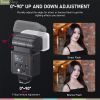 • Khớp gập linh hoạt cho phép điều chỉnh góc chiếu sáng theo 7 mức, từ 0° đến 90°, hỗ trợ đánh đèn trực tiếp (Direct Flash) hoặc hắt sáng (Bounce Flash) để tạo hiệu ứng ánh sáng mềm mại hơn.